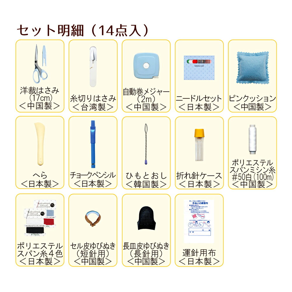 ■サイズ パッケージサイズ:15×21×2.5(cm) ■セット内容 1.ステンレス裁ちはさみ(17cm) 2.糸切りはさみ 3.自動巻メジャー(2m) 4.ニードルセット 5.ピンクッション 6.チョークペンシル 7.へら 8.ひもとおし 9.折れ針ケース 10.ポリエステルスパン糸4色 11.ポリエステルスパンミシン糸#50白(100m) 12.セル皮ゆびぬき(短針用) 13.長皿皮ゆびぬき(長針用) 14.運針用布 メーカー希望小売価格はメーカーカタログに基づいて掲載しています。