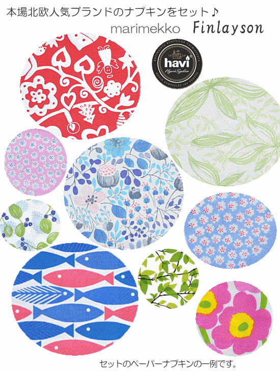 セットには、デコパージュ用のりケマージュはもちろん、北欧の人気ブランド、marimekko(マリメッコ) Havi(ハビ) Finlayson(フィンレイソン)などの素敵なデザインのペーパーナプキン。