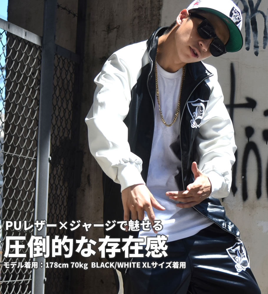 商品説明 LAのストリートカルチャーを表現した当店人気NO.1ブランド"DOP"から、 PUレザーとジャージで切り返したセットアップが登場! さらに、今季よりブラック×ホワイトが新色で登場しました! 美しい艶を放つブラックジャージボディーに袖はラグランスリーブでPUレザーを施した。